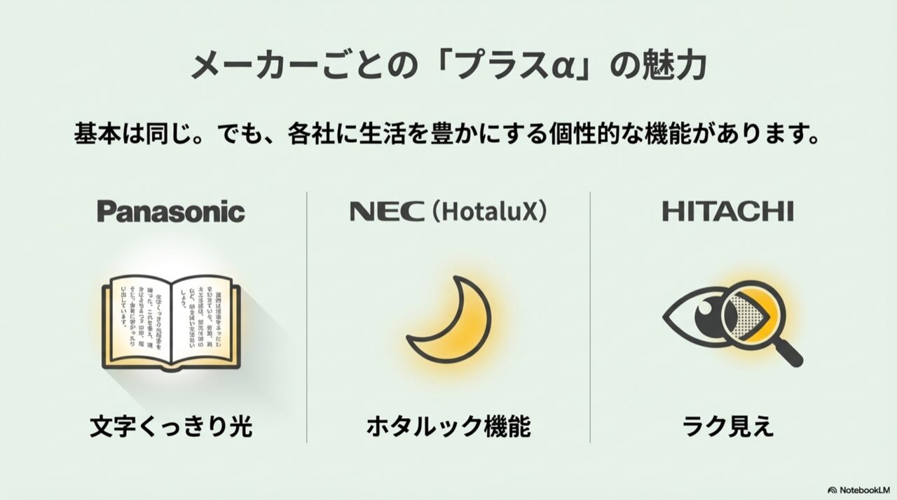 国内の主要な照明メーカーであるパナソニック、NEC(ホタルクス)、日立は、それぞれ独自の便利な機能を搭載しており、操作仕様にも少しずつ特徴があります。