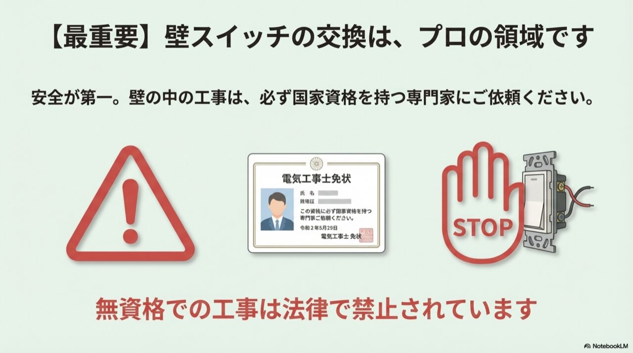 【重要】壁スイッチの交換は「電気工事士」の資格が必須です!