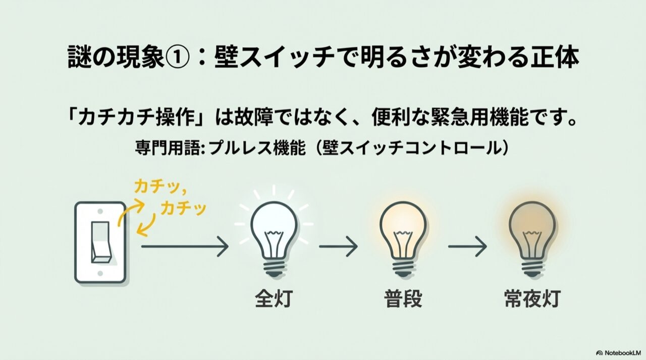 それは、壁のスイッチを「カチッ、カチッ」と2秒以内くらいの短い間隔で素早くON/OFFを繰り返すと、照明のモードが「全灯(100%の明るさ)→普段(少し抑えた明るさ)→常夜灯(豆電球)→消灯」といった具合に順番に切り替わっていく動作です。