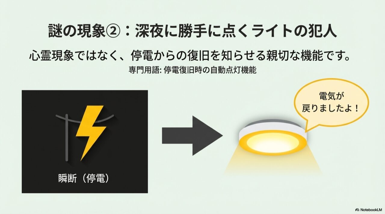 深夜にほんの一瞬だけ停電し、すぐに復旧した場合でも、照明が点灯してしまい、寝ている方からすると「勝手に点いた!」と驚いてしまうわけです。