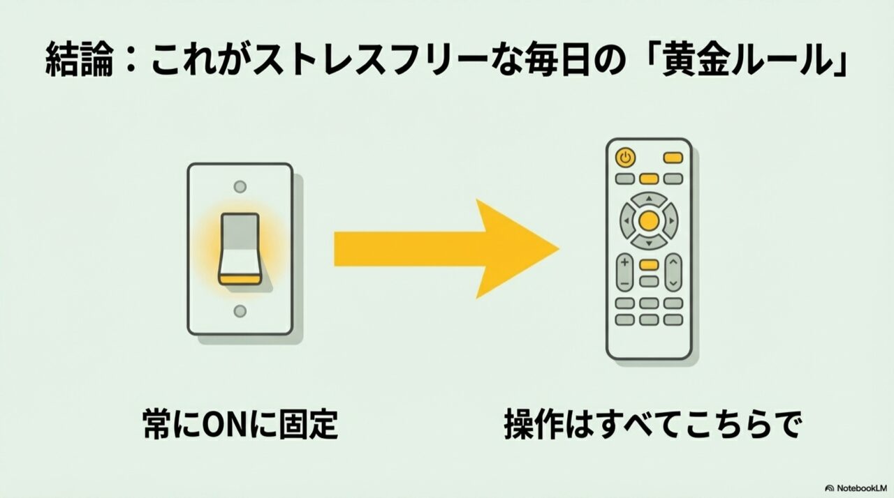 - 2.5.1. 【最適解】基本は「壁スイッチON固定、リモコンで操作」