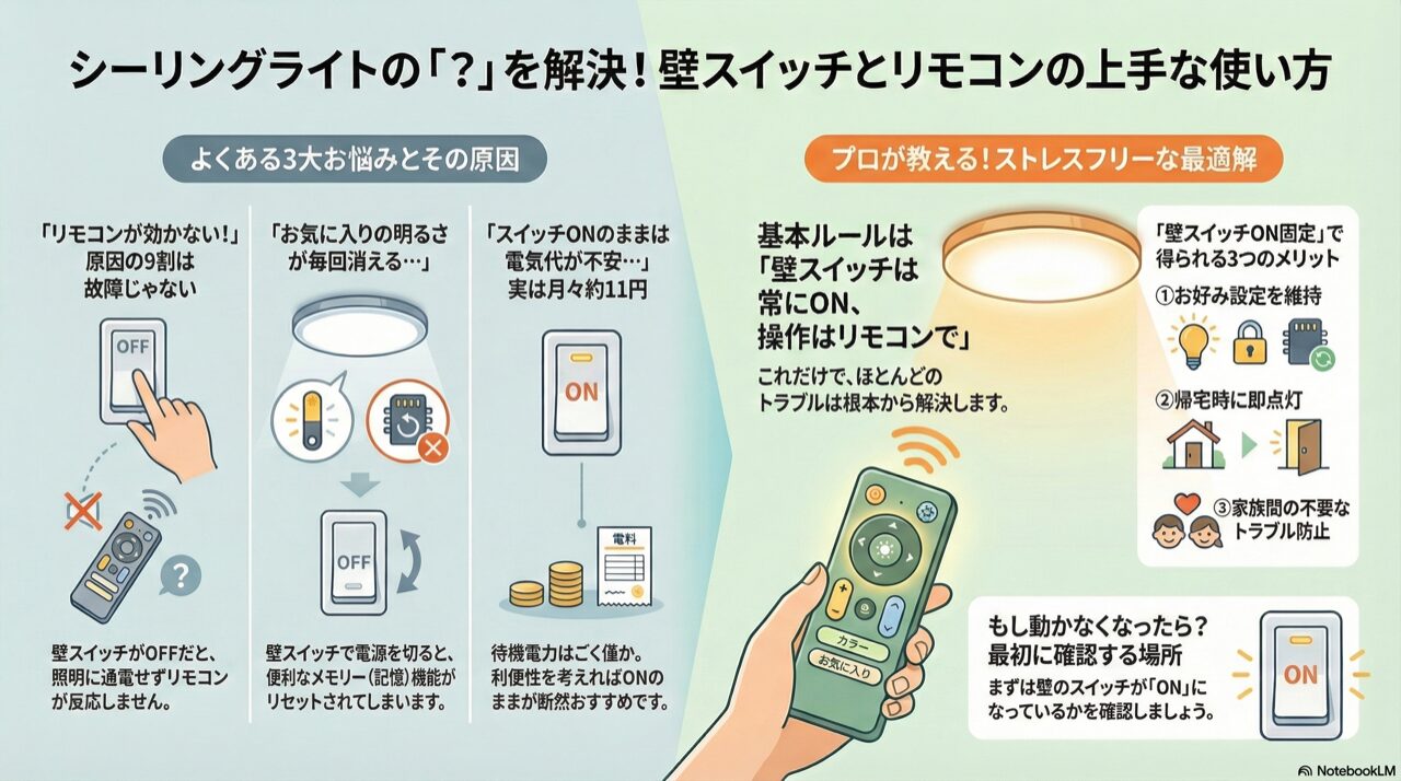 - 2. シーリングライトの壁スイッチとリモコン併用の解決策