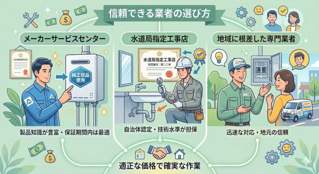 - 修理依頼先はメーカーや水道局指定工事店が信頼できる