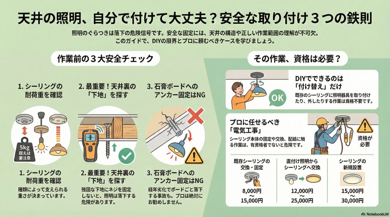 ここまで、引っ掛けシーリングの天井固定について、種類や下地探し、DIYの範囲から専門業者への依頼まで、様々な角度から詳しくお話ししてきました。