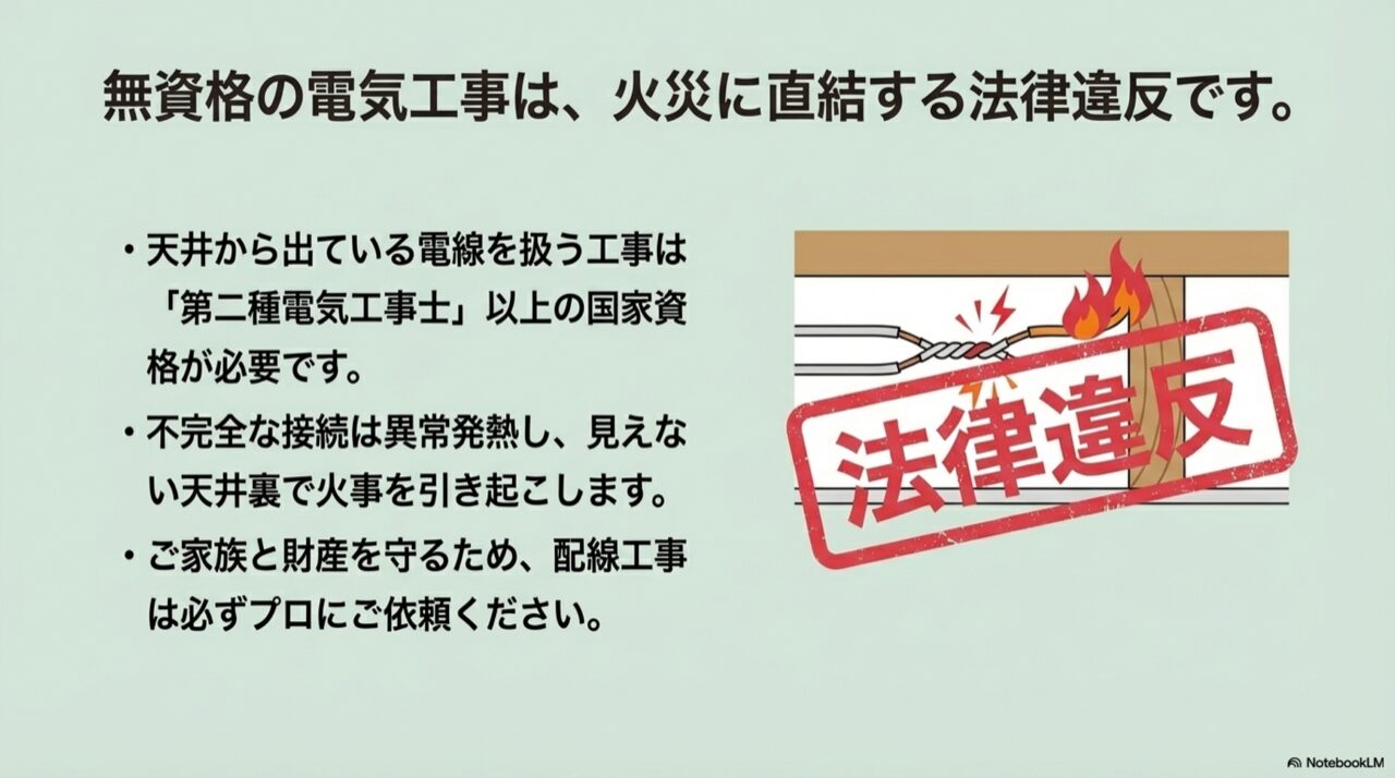これは脅しでも何でもなく、電気工事士法という法律で厳格に定められたルールです。なぜなら、資格のない方が見様見真似で配線工事を行うと、接続が不完全(接触不良)になる可能性が非常に高いからです。