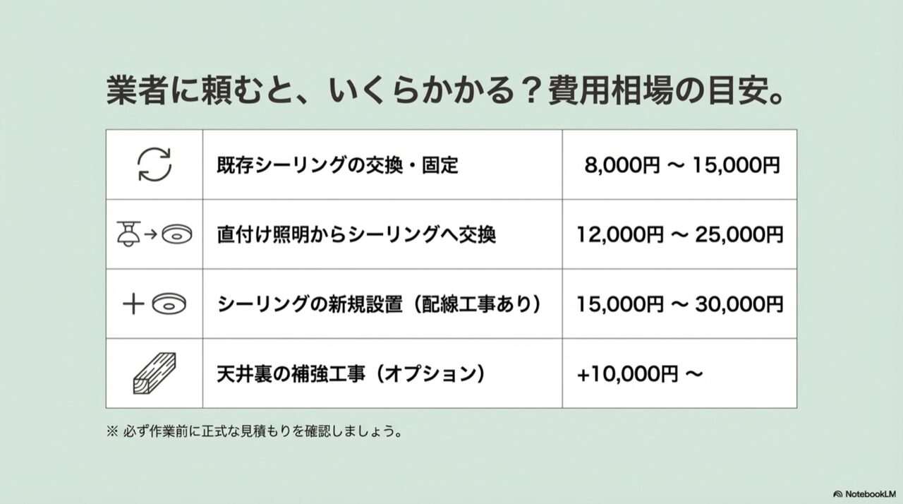 費用の内訳や追加料金のポイントは、『引っ掛けシーリングの取り付け工事費用ガイド【相場と節約策】』の記事もあわせて読むと把握しやすくなります。