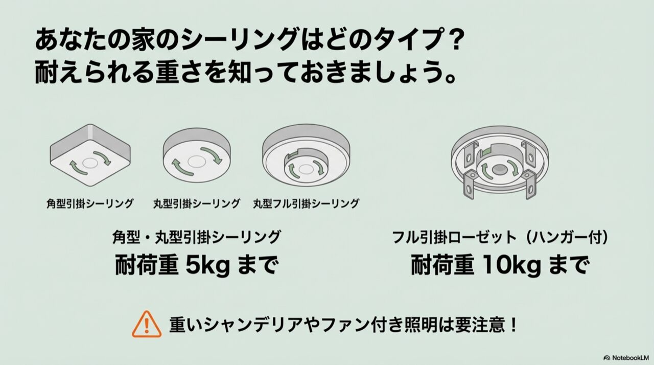 安全な作業のためには、いくつか事前に知っておいていただきたい大切な基本知識があるんです。「こんなはずじゃなかった…」と後悔しないためにも、まずはご自宅のシーリングの種類や天井の構造について、ここで一緒にじっくりと確認していきましょうか。急がば回れ、ですね。