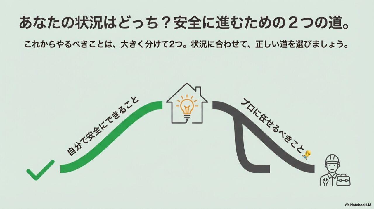 自分で安全にできることとプロに任せるべきことを分ける分岐点のイラスト