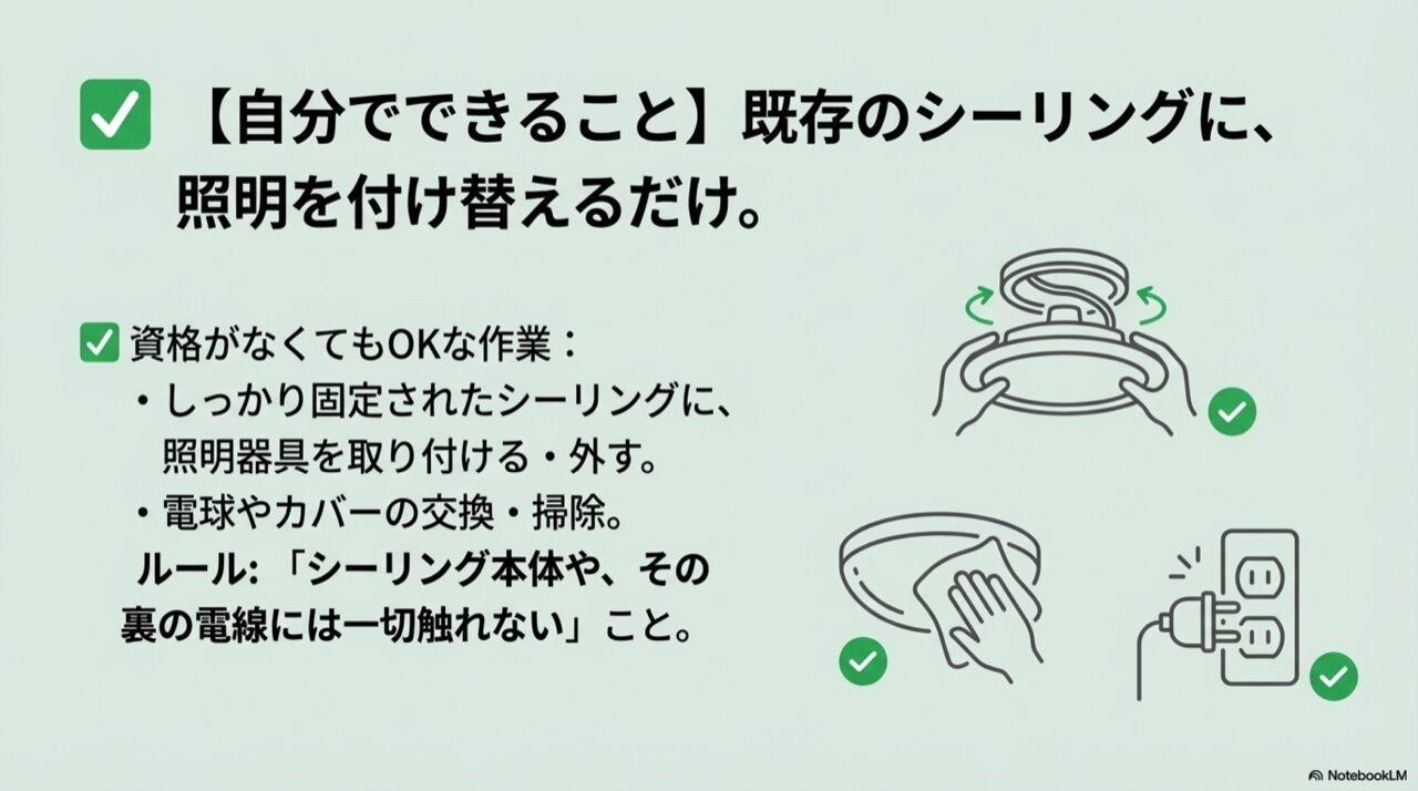 先ほども少し触れましたが、電気工事士の資格がなくても、ご自身で安全に行うことが法律で認められている作業範囲は、明確に決められています。照明器具の取り付けに関しては、以下の通りです。