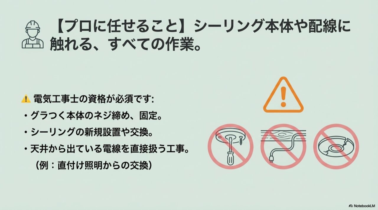 しかし、「シーリング本体や、その裏にある電線を少しでもいじる」作業は、すべてプロの領域、と覚えておいていただければ間違いありませんね。