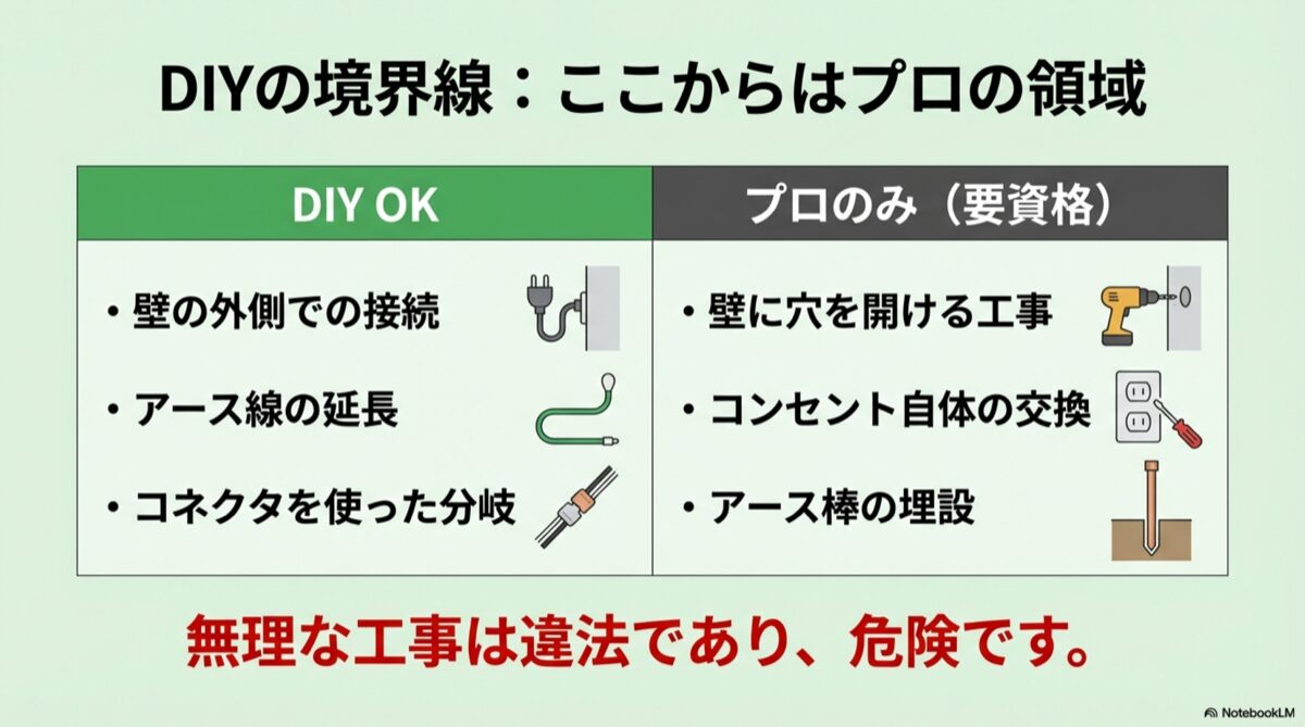 「どこまでが自分で安全にできて、どこからがプロの領域なのか?」という線引きは、「電気工事士法」という法律によって明確に定められています。