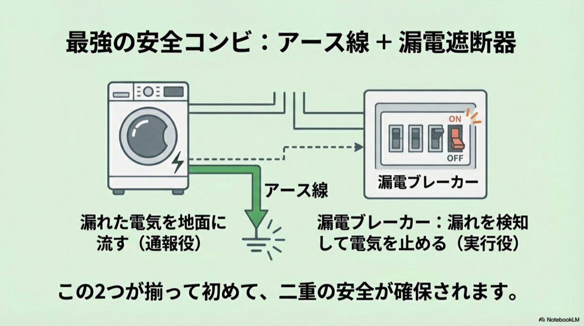 このように、アース線が「異常を知らせる通報役」となり、漏電遮断器が「電気を止める実行役」となることで、二重の安全が確保されているわけです。