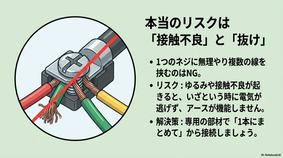 ただし、1つのネジ式アース端子にアース線を2~3本まとめて噛ませる方法は、端子の構造や線の太さによっては締め付け不良(ゆるみ・抜け・接触不良)を起こしやすく、安全とは言い切れません。