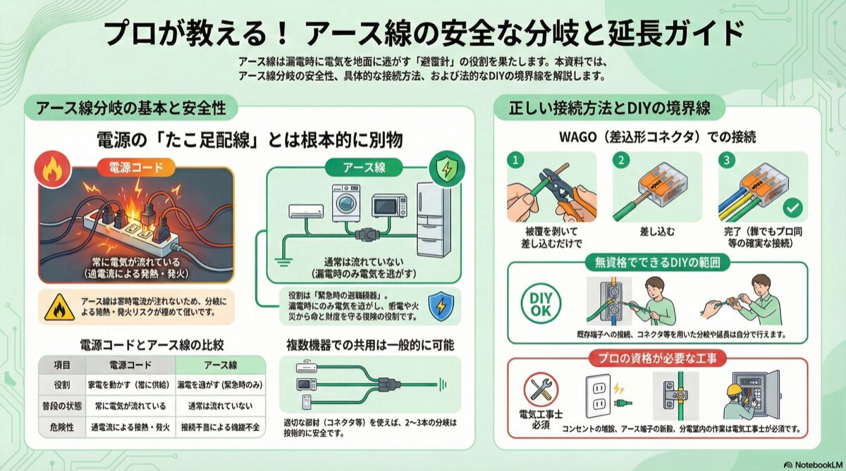 しかし、アース線の分岐と電源のたこ足配線は、その危険性の性質が全く異なり、同列に語ることはできません。