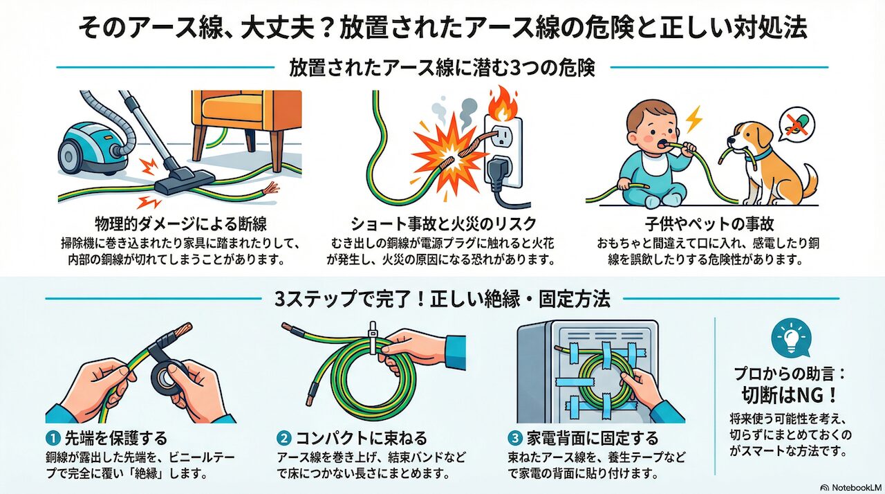 アース線は「家電を動かすための線」ではなく、「人の命を守るための命綱」です。