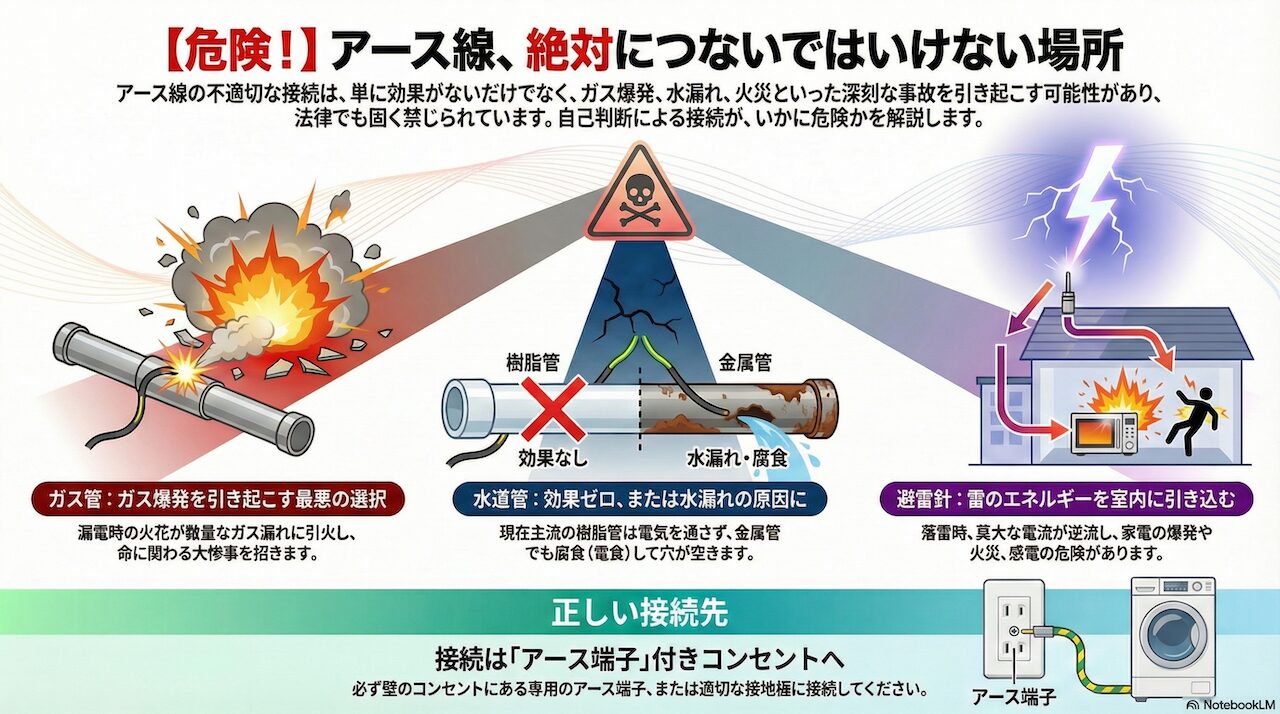 間違った場所に接続すると、アースの効果が得られないどころか、ガス爆発や水漏れ、火災といった深刻な二次災害を引き起こす引き金になりかねません。