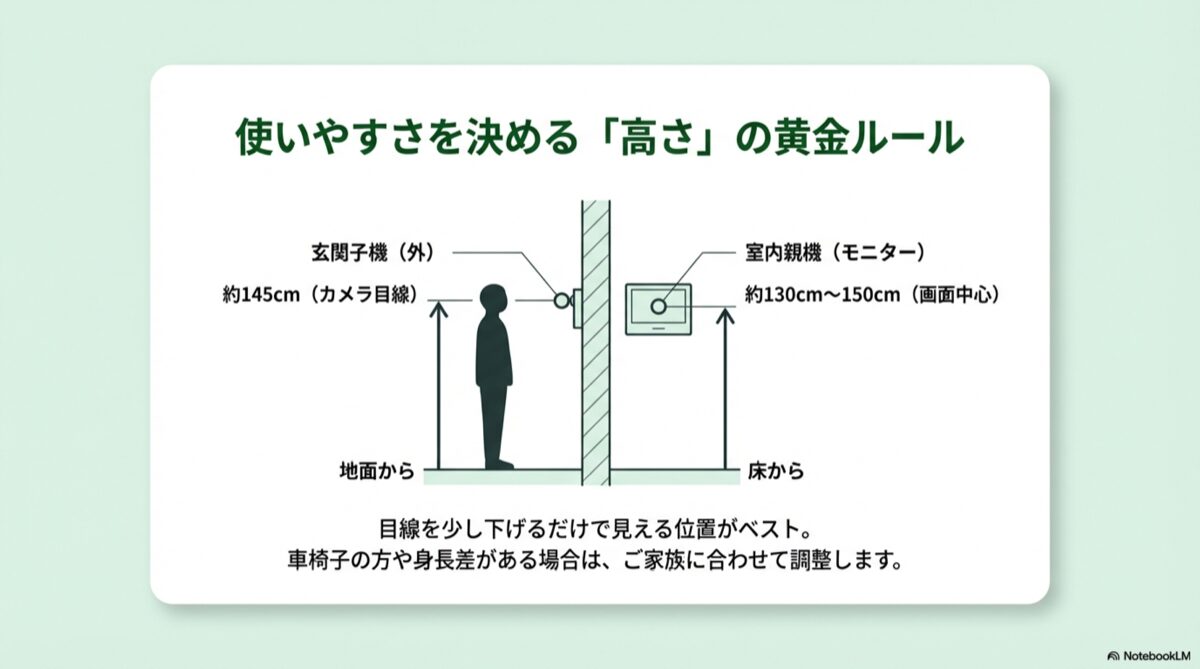 これはあくまで一般的な基準です。例えば、車椅子をご利用のご家族がいらっしゃる場合は、それに合わせて親機の高さを低めに設定するなど、ご家庭の状況に応じて柔軟に調整することが何よりも大切です。