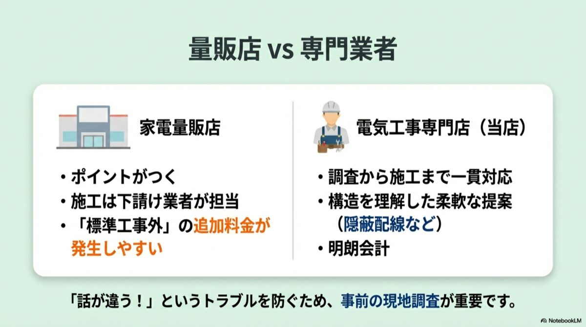 一方で、知っておくべき注意点もあります。それは、実際に工事を担当するのが家電量販店の社員ではなく、提携している下請け業者であることがほとんどだということです。