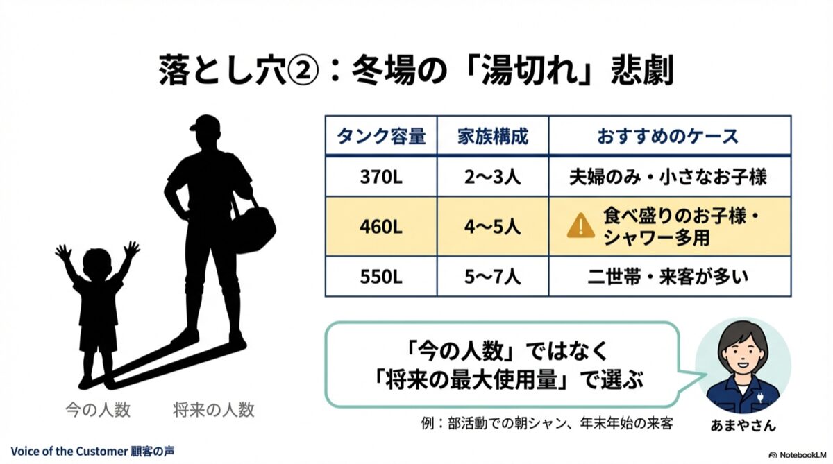 先ほども「お湯切れ」のセクションで触れましたが、タンク容量の選択はエコキュート選びの最重要ポイントと言っても過言ではありません。