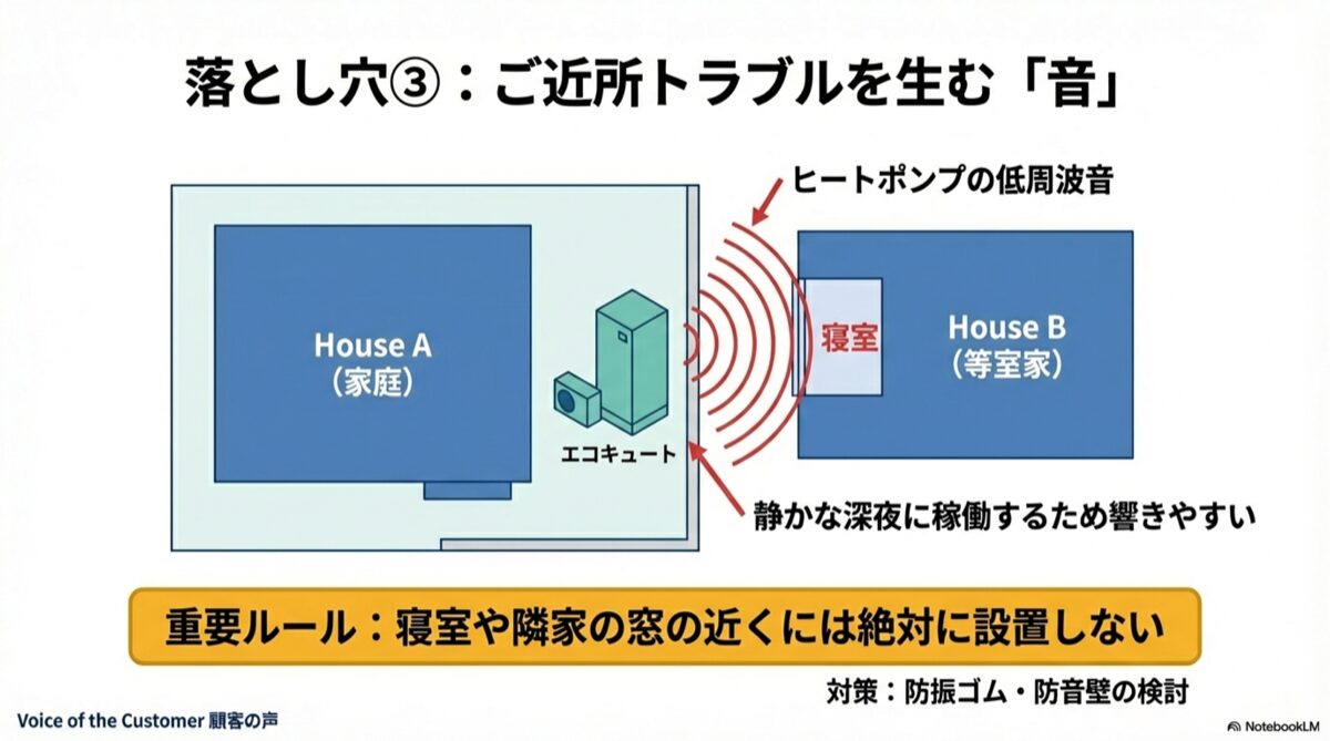 実際に、「隣家からエコキュートの音がうるさいと苦情が来て、眠れないと言われた」というトラブルは決して珍しくありません。