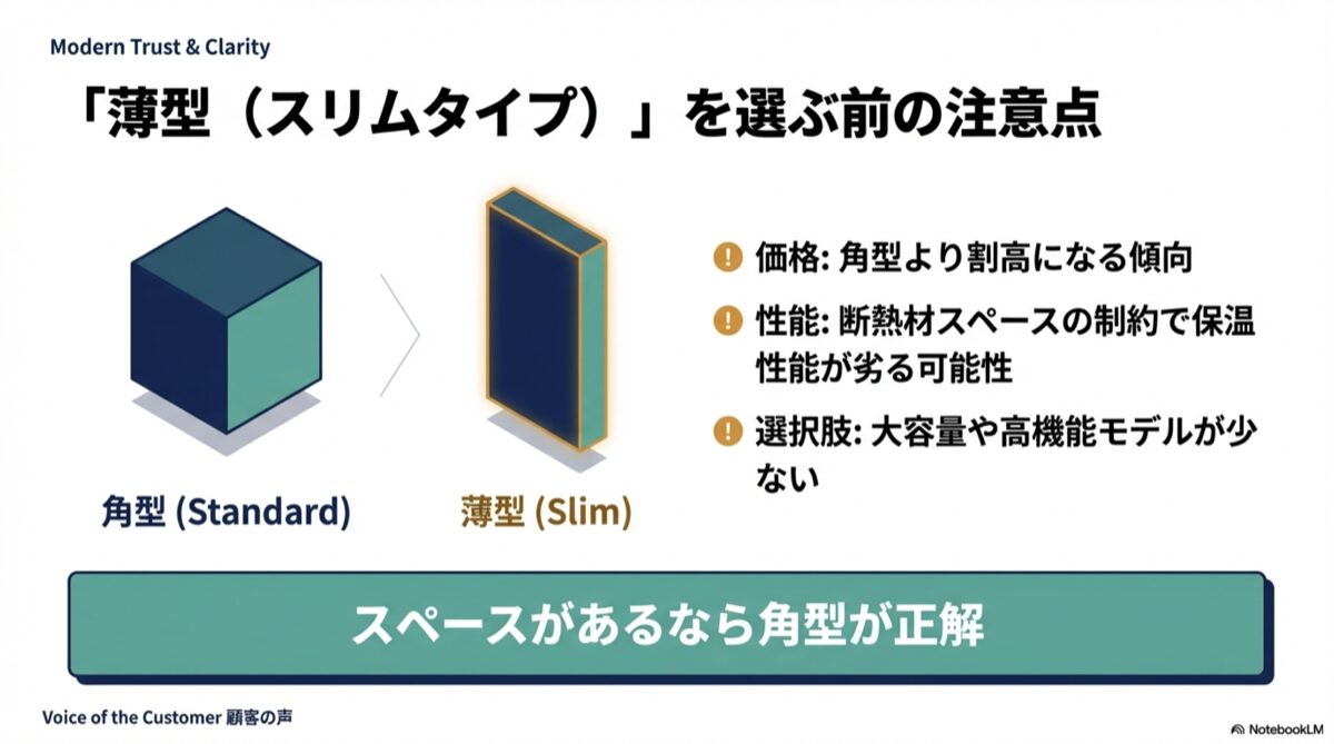 もちろん、設置スペースの問題でどうしても薄型しか置けないというご家庭はたくさんあります。その場合は薄型が最良の選択肢です。