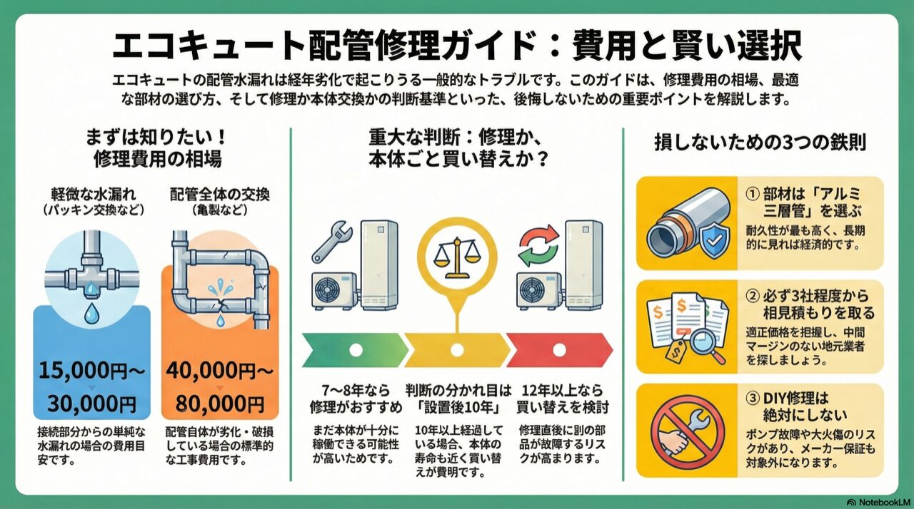12年以上経過している場合は、修理費を頭金にして、最新の高効率エコキュートへの買い替えを検討するのが経済的にも安全面でも賢明な選択です。