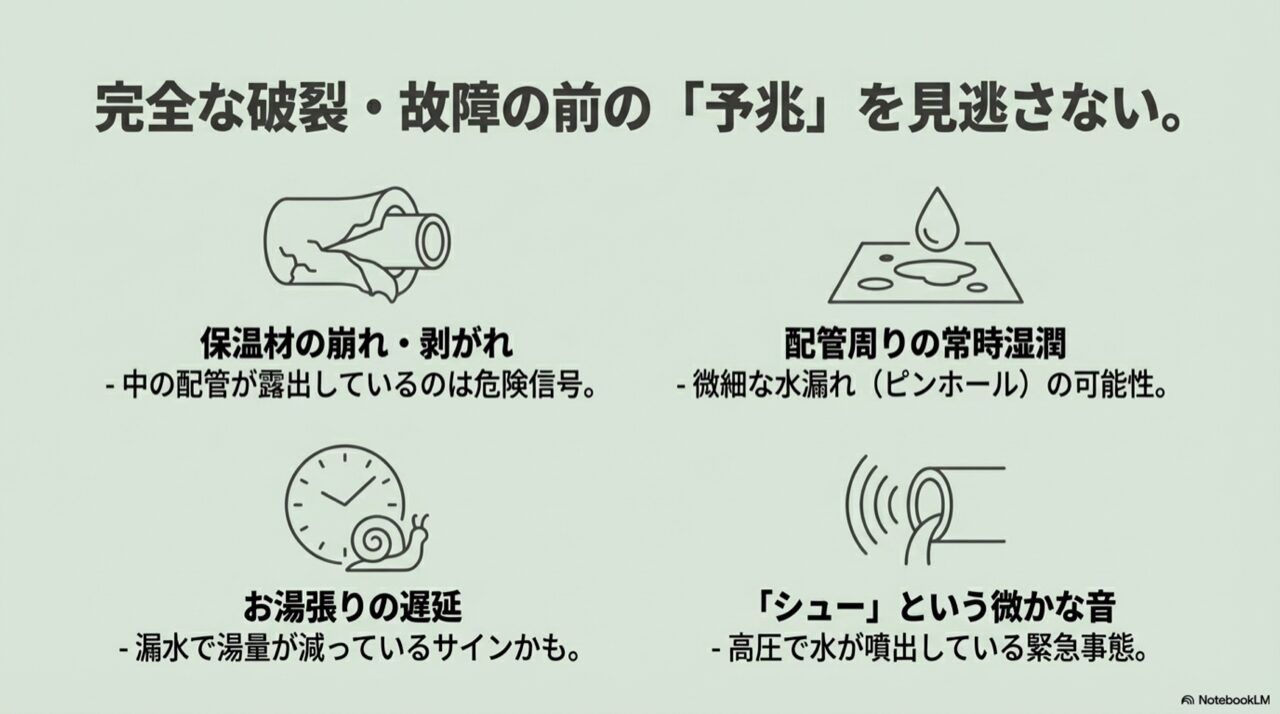 交換時期を見極めるための具体的なサインとしては、以下のような現象が挙げられます。これらは完全な破裂や大規模な故障の前兆ですので、見つけ次第、早めの対処が必要です。