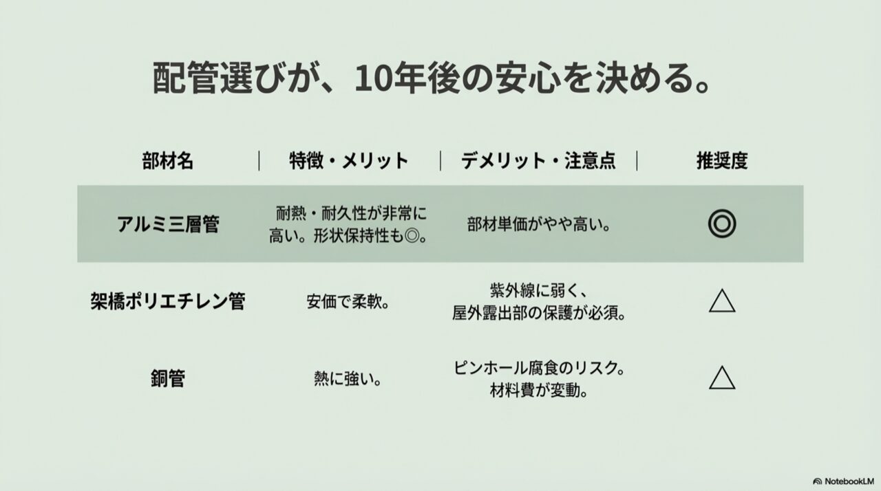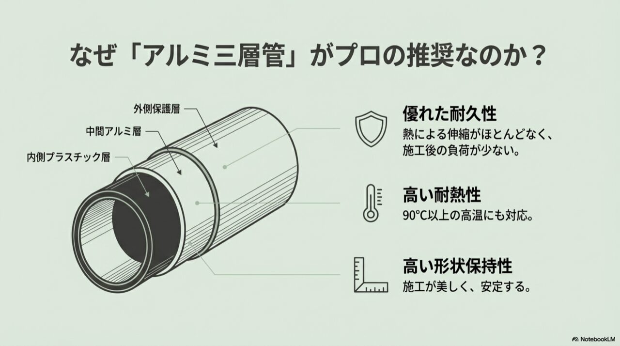 - プロが推奨する「アルミ三層管」などの部材の違いを理解できます