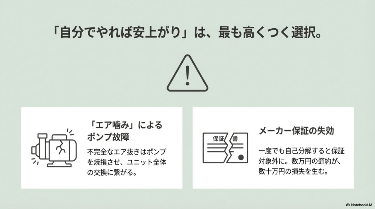 最大のリスクは「エア噛み」による循環ポンプの故障です。単に新しい配管をつなげば終わりではなく、施工後にはポンプ内部や配管内の空気を完全に排出する「エア抜き試運転」という工程が不可欠です。