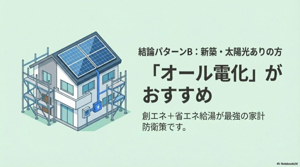 これから建てるなら、「オール電化+太陽光発電」が最強のコストパフォーマンスを誇ります。新築時なら設置工事費も割安になりますし、住宅ローンに組み込めば月々の負担感もありません。