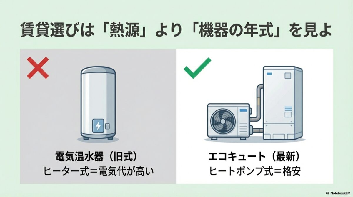 賃貸物件を探す際、「オール電化」という条件だけで決めてしまうのは非常に危険です。賃貸における光熱費の差は、熱源の種類そのものよりも、「設置されている機器の世代(年式)」に左右されるからです。
