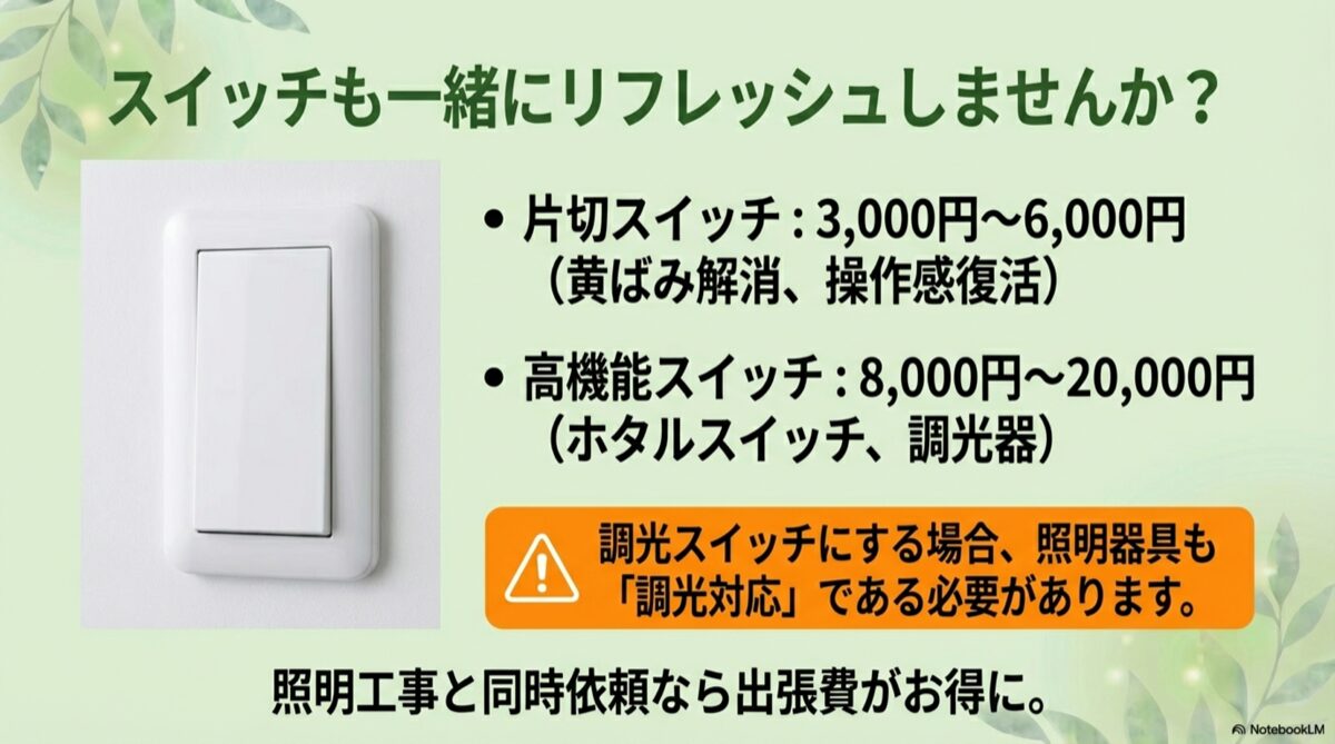 照明器具だけでなく、壁についているスイッチを新しいもの(例:ON/OFF時にランプが光るホタルスイッチや、明るさを調整できる調光スイッチなど)に交換する工事も、配線を触るため資格が必要です。