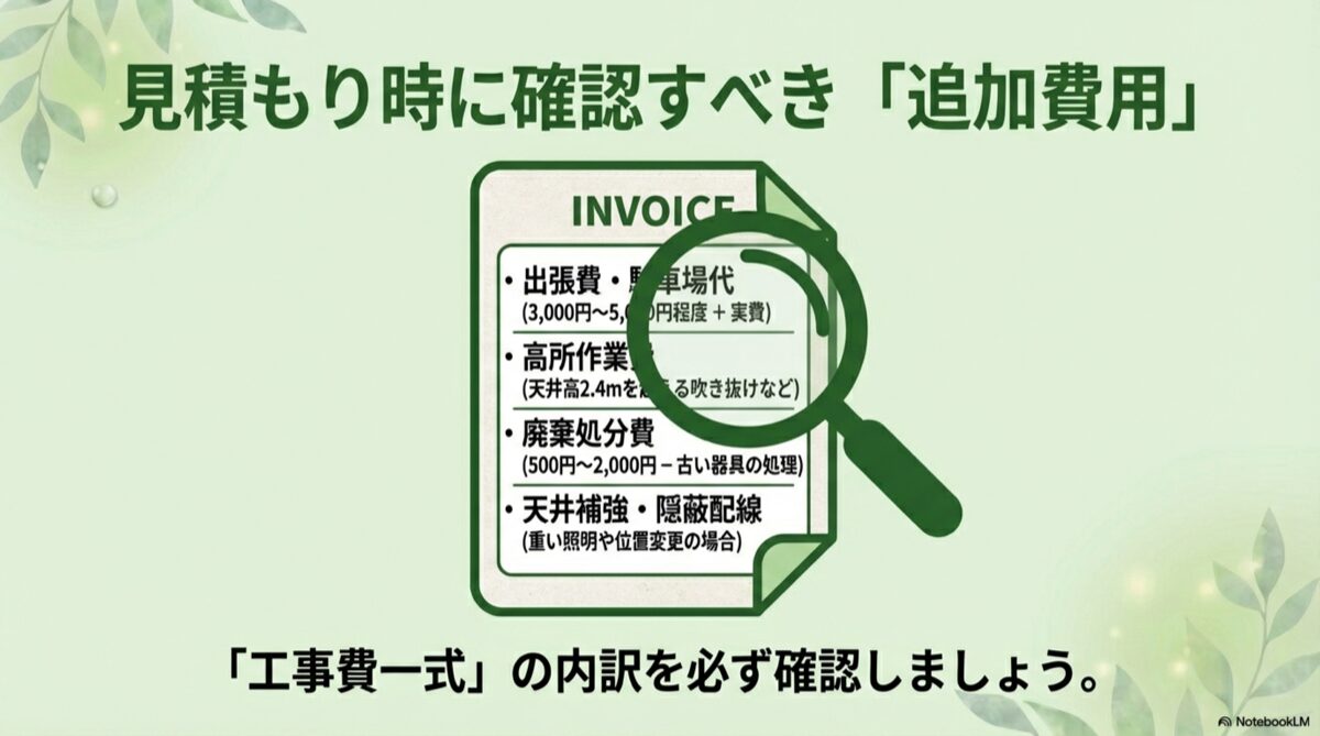 上記の工事費に加えて、業者によっては出張費(おおよそ3,000円~5,000円程度)や、取り外した古い照明器具の処分費(500円~2,000円程度)が別途必要になる場合があります。