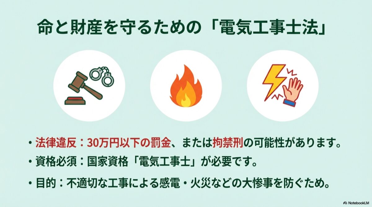 火災や感電という命に関わるリスク、そして法律違反となり罰則を受ける可能性があるという事実を、ぜひ心に留めておいていただければと思います。