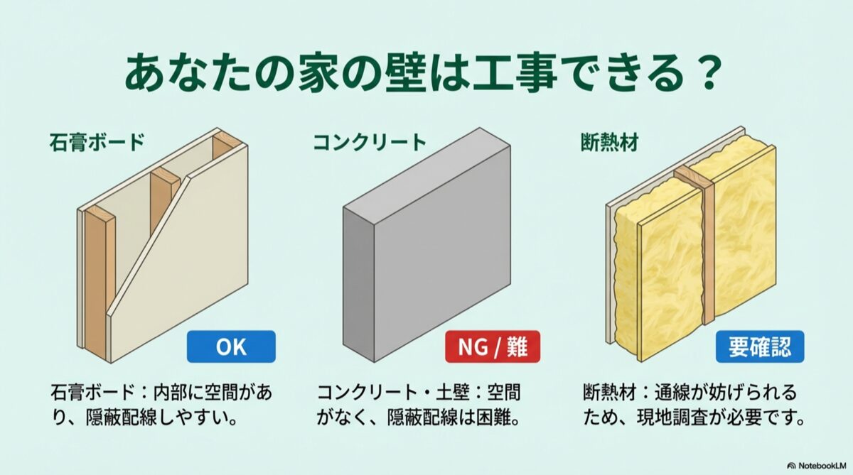 さて、工事をプロに依頼すると決めたとしても、「うちの壁って、本当に隠蔽配線できるのかな?」という疑問が湧いてきますよね。
