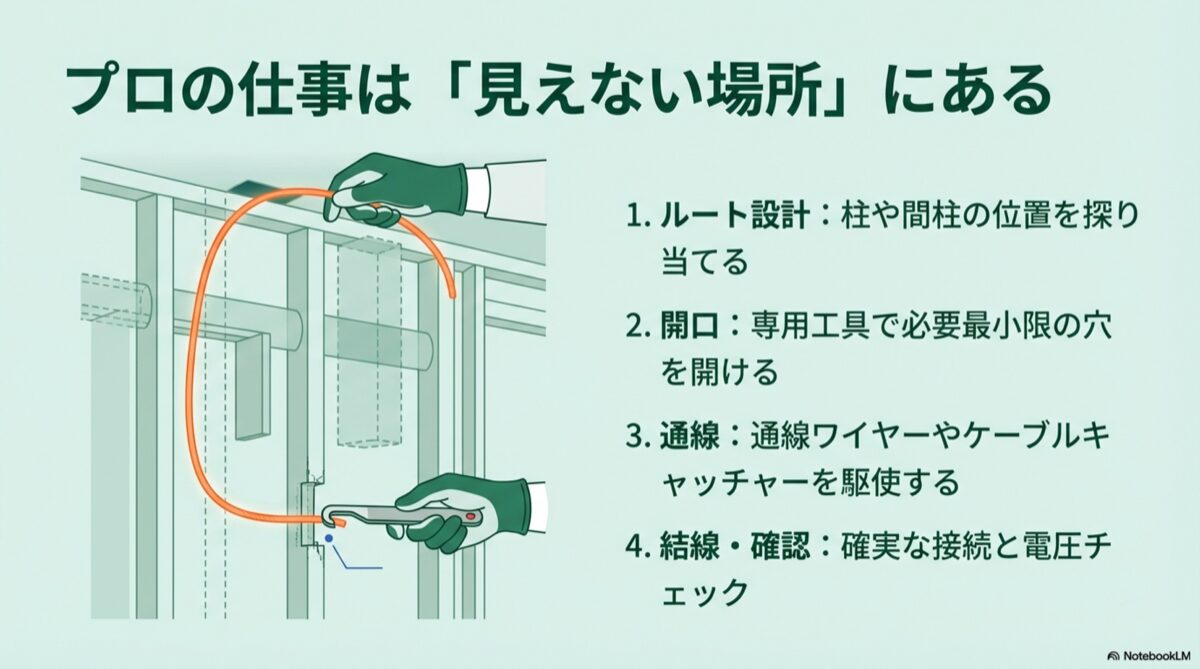 壁の構造を正確に読み解く知識、障害物を避けて電線を通す高度な技術、そして予期せぬ事態に対応できる豊富な経験が不可欠となります。