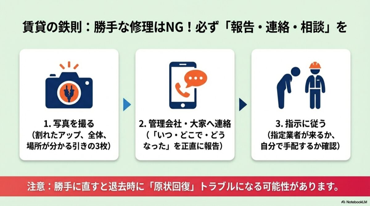 持ち家とは違い、賃貸物件の場合は、勝手に業者を呼んで修理してしまうと、後々トラブルの原因になることがあります。まずは落ち着いて、正しい手順を踏むことが何よりも大切です。