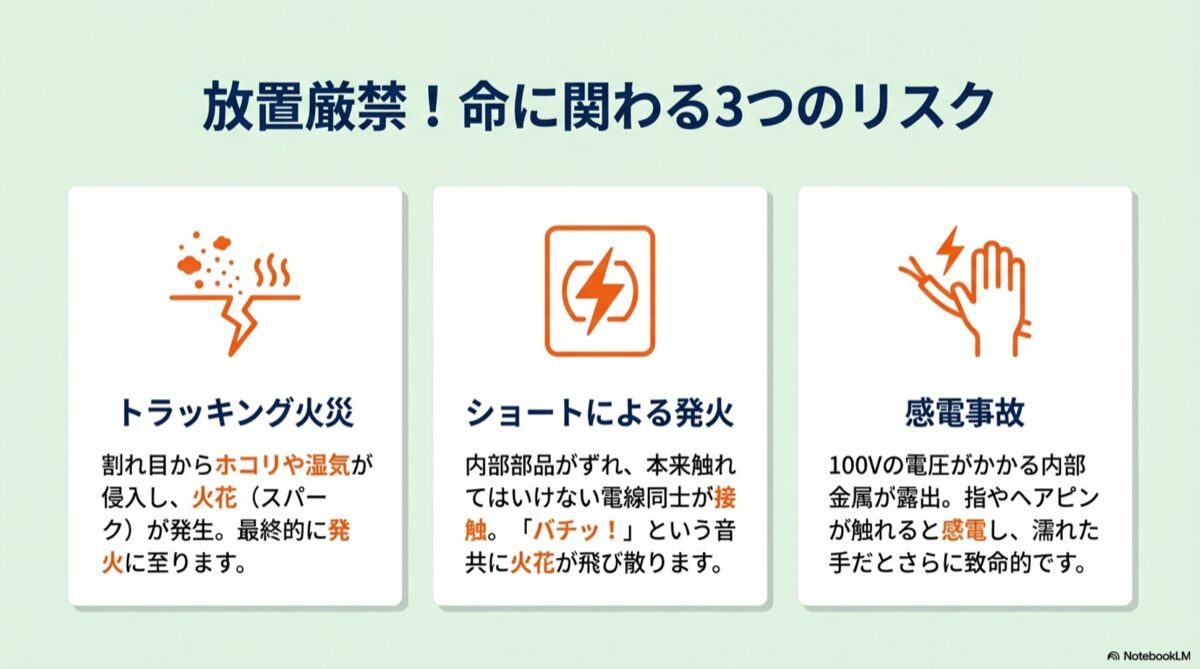 見た目は小さなひび割れでも、その裏にはトラッキング火災や感電といった、生活を脅かす大きなリスクが潜んでいます。発見したらすぐに対処を検討してください。