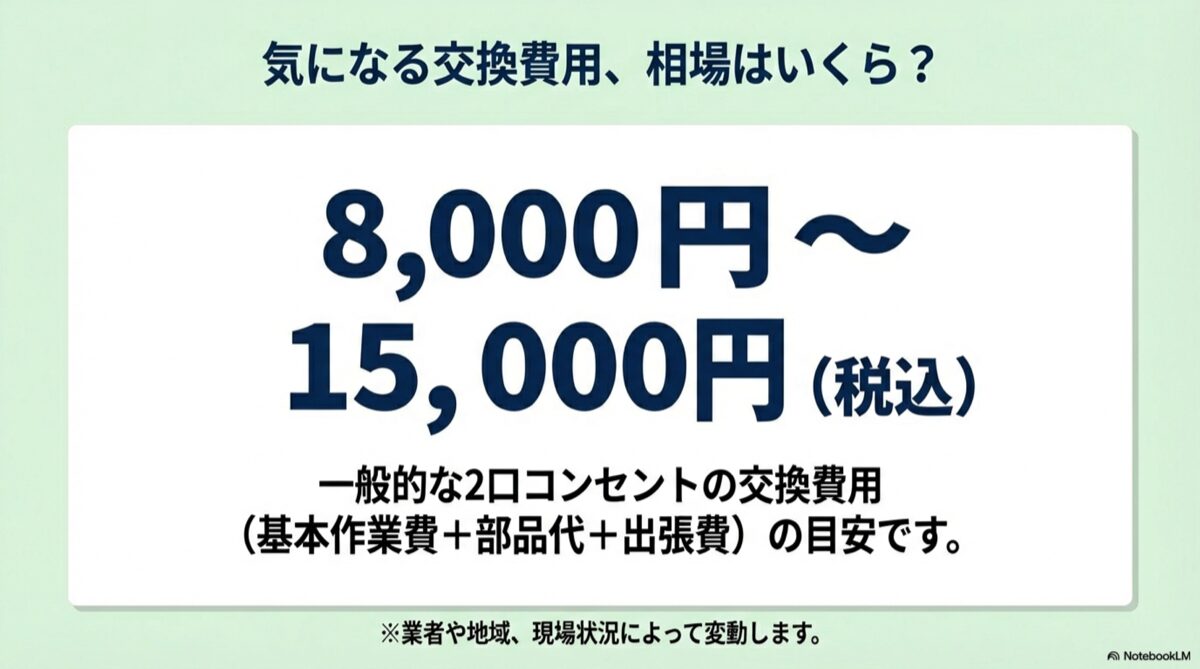 もちろん、これはあくまで標準的な工事の場合の価格帯です。依頼する業者さん、お住まいの地域、交換するコンセントの種類、そして現場の状況によって金額は前後します。