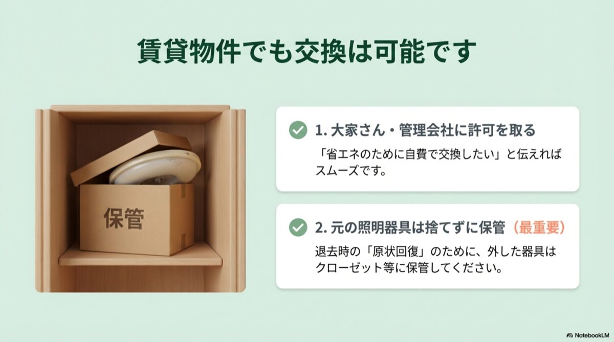 これが最も重要です。工事の前に必ず「備え付けの照明器具が古くなっており、省エネ性能の高いLED照明に自費で交換したいのですが、よろしいでしょうか?」という形で連絡し、許可を得ましょう。
