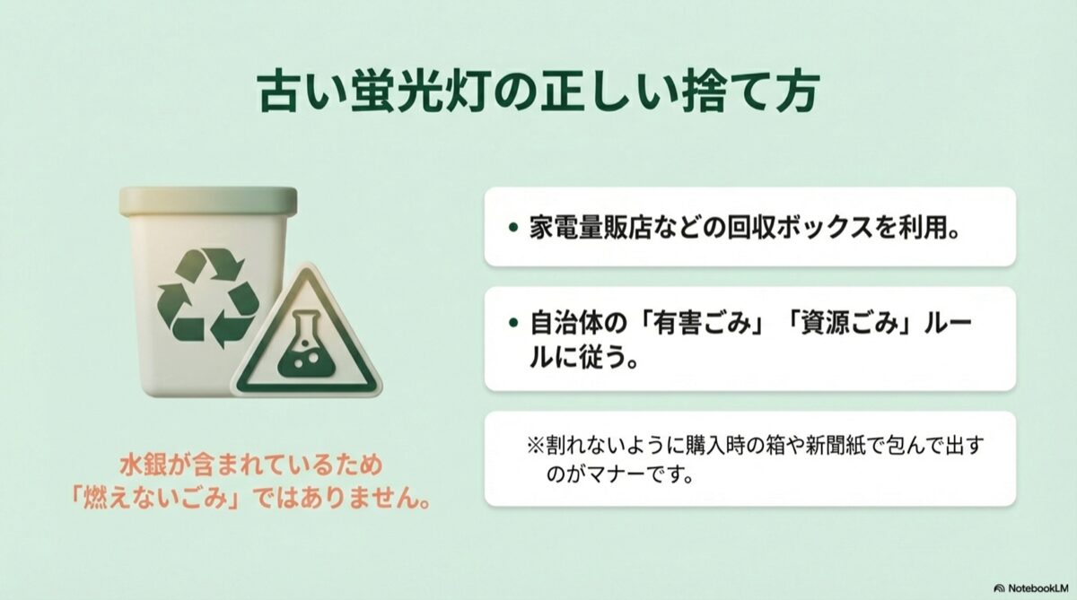 そのため、割れてしまうと水銀が飛散する恐れがあり、一般の不燃ごみやプラスチックごみとして捨てることは、多くの自治体で禁止されています。