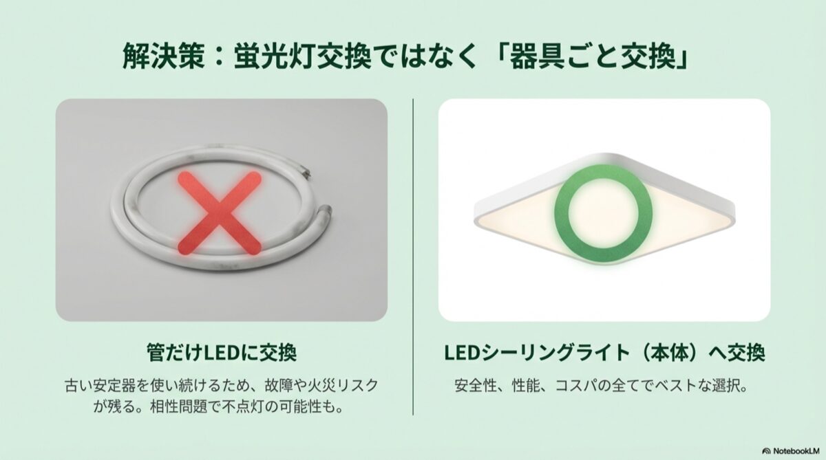 何より、寿命の近い古い照明器具を使い続けるという根本的な安全上のリスクは残ったままです。そう考えると、無理に蛍光灯を探し続けるよりも、次のステップに進むことを私たちは強くおすすめします。