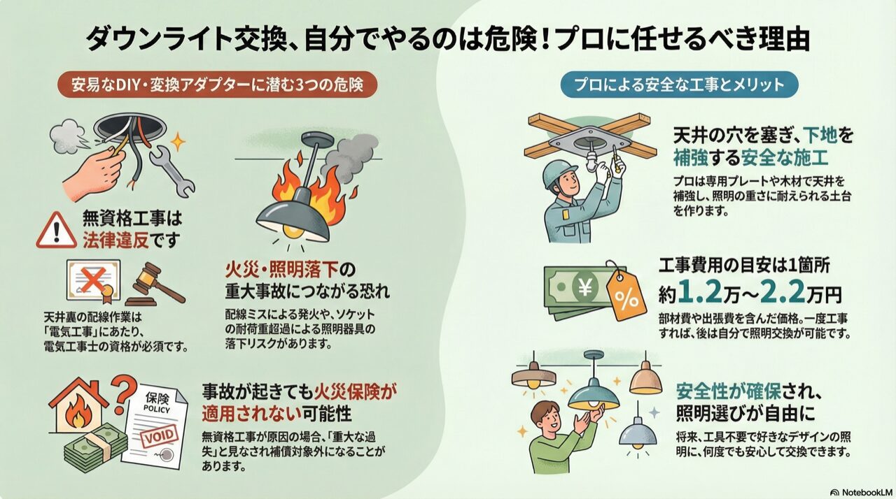 まず最初に、ダウンライトを引っ掛けシーリングに変更するための具体的な工法と、その際に絶対に知っておいていただきたい技術的・法的な注意点についてお話しします。