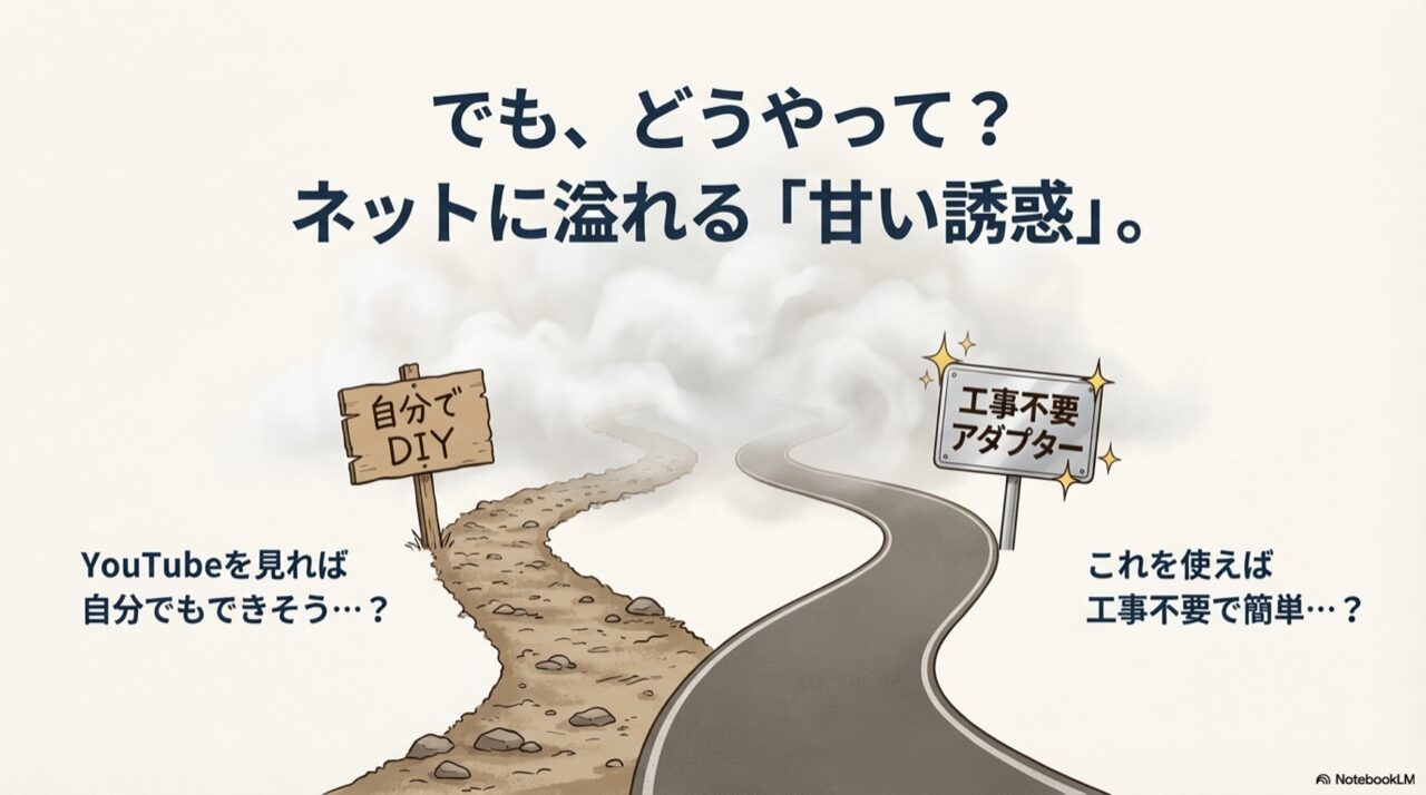 ただ、いざ「自分でやってみようかな」とネットで検索してみると、工事費用の相場や必要な資格のこと、賃貸マンションやアパートでの契約上の制約、さらには「変換アダプターを使えば工事不要で簡単」といった甘い誘い文句まで、様々な情報が溢れていて、何が正解で何が危険なのか迷ってしまうことも多いのではないでしょうか。