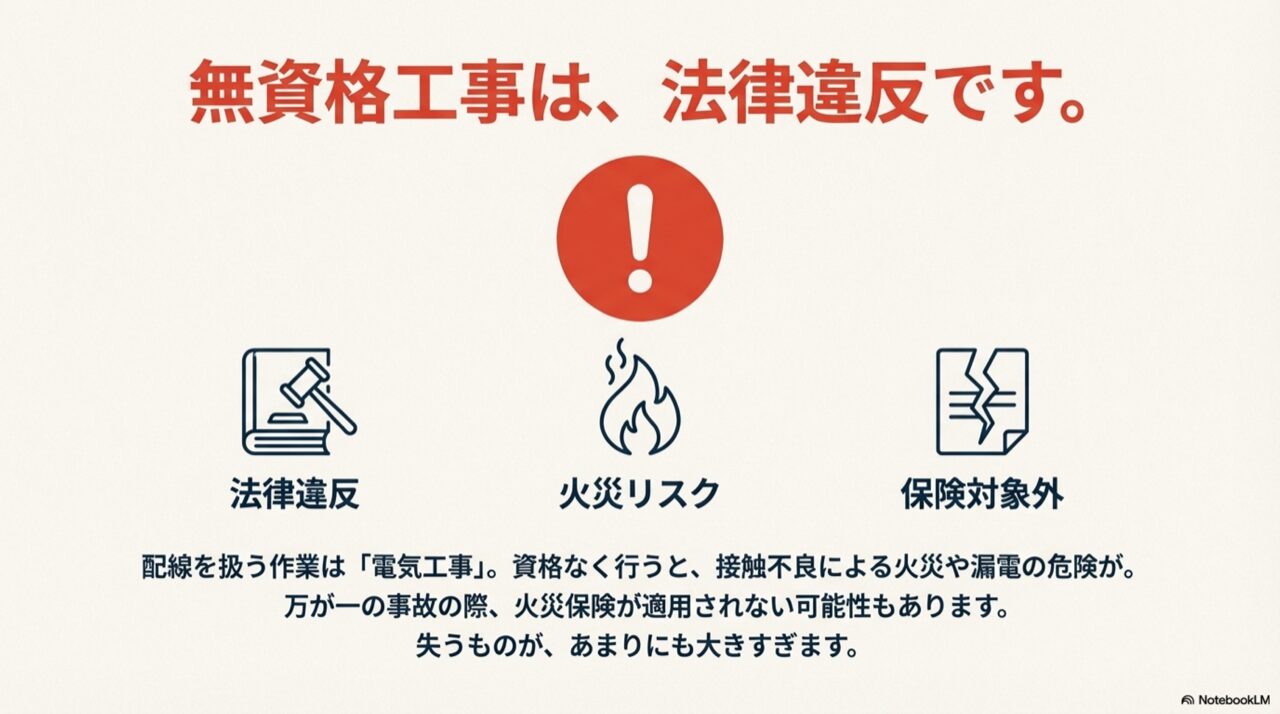 数万円の工事費を節約しようとして、家や財産、最悪の場合は命を失うリスクを負うことは絶対におすすめできません。(出典:経済産業省『電気工事の安全(資格が不要な軽微な工事の範囲等)』)