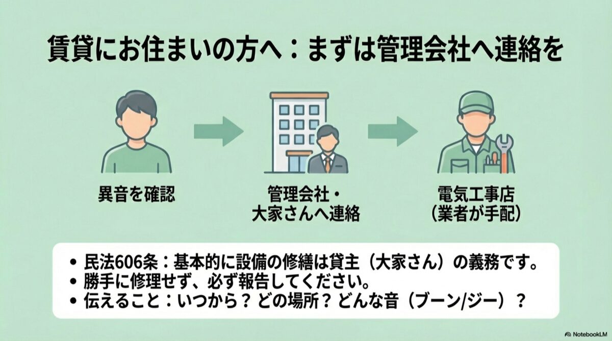 特に危険な兆候がなく、「ブーン」という音が気になる、といった段階であれば、まず契約書を確認し、大家さんや管理会社へ状況を具体的に報告してください。その後の対応は、貸主側の指示に従いましょう。