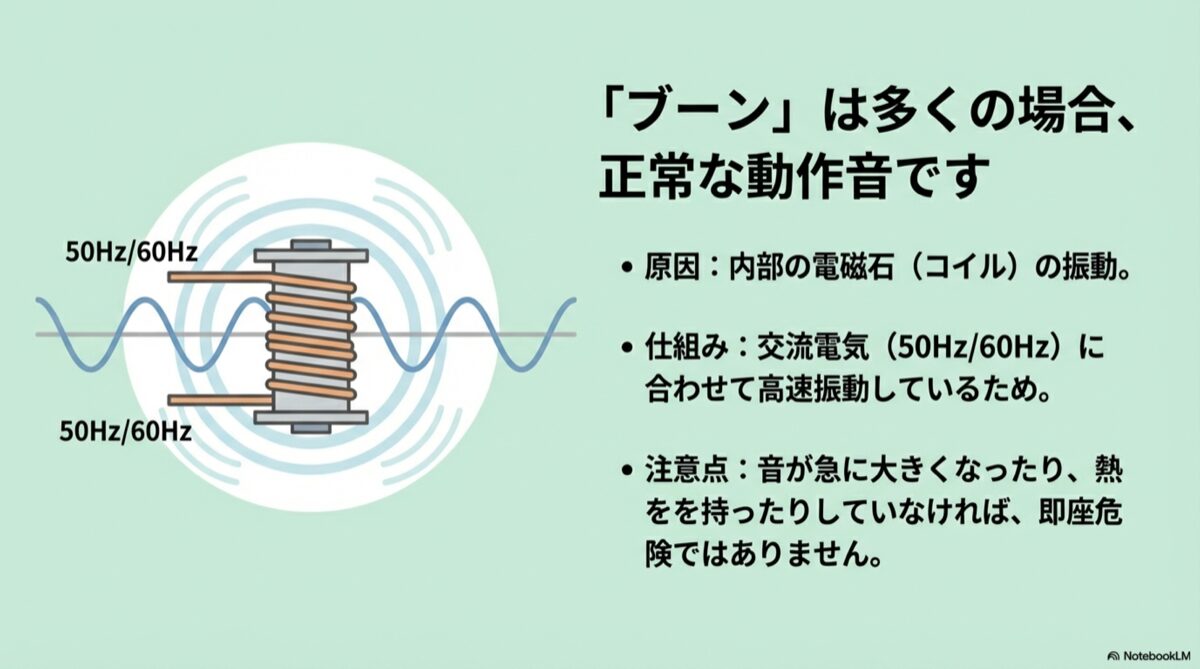 それではまず、多くの方が気にされている「ブーン」という音の正体と、その危険度について掘り下げていきましょう。