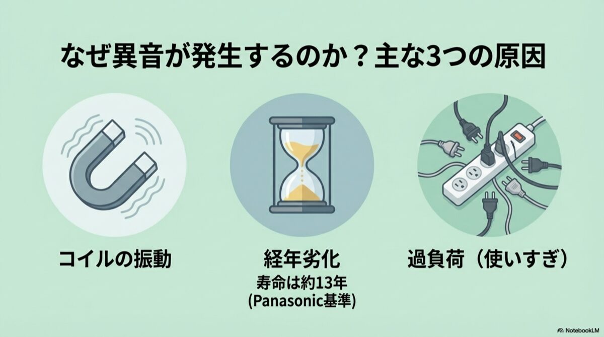 では、なぜこのような異音が発生するのでしょうか。その原因をもう少し詳しく見ていきましょう。主な原因は「コイルの振動」「部品の劣化・緩み」「過負荷」の3つです。