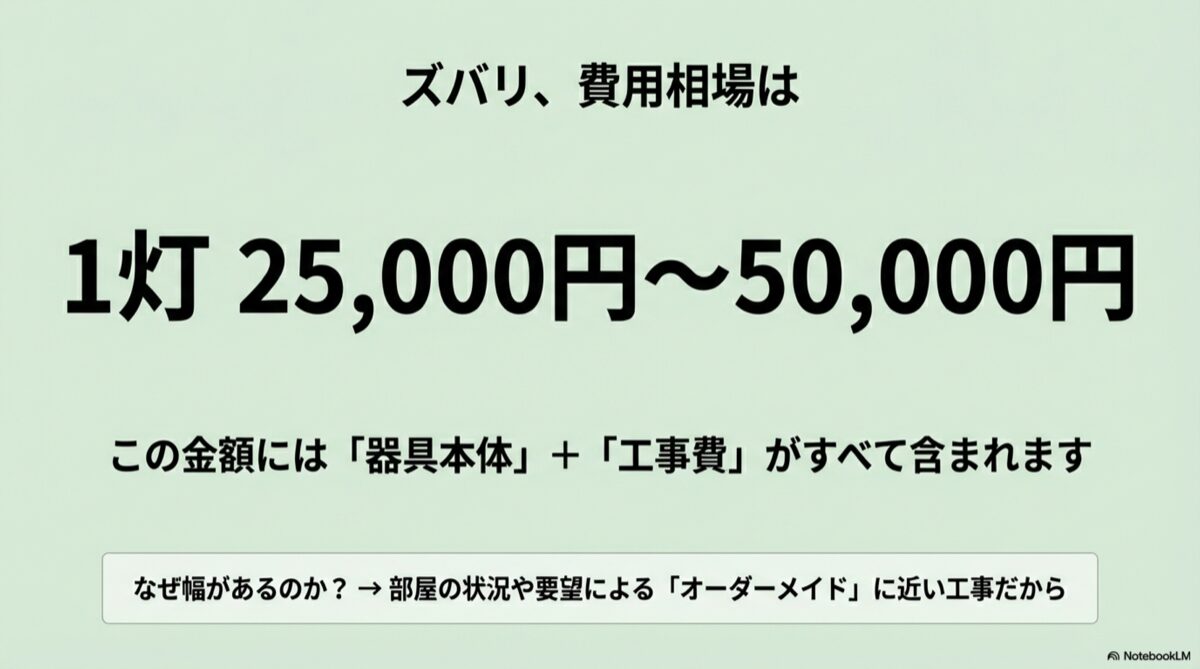 この金額には、ダウンライト本体の価格と、取り付けに必要な工事費がすべて含まれています。「同じ1灯なのに、なんでこんなに価格に幅があるの?」と疑問に思いますよね。