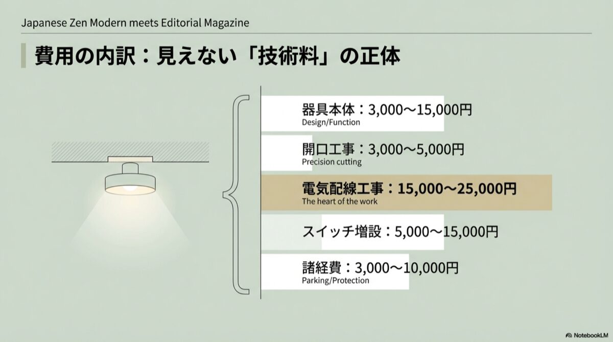 マンションにダウンライトを後付けする場合、実際にどれくらいの費用を見込んでおけば良いのか。そのリアルな相場観と、価格の内訳について、プロの視点から詳しく解説していきますね。